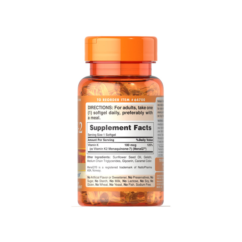 Vitamin K-2 (MenaQ7) від компанії зі США Puritan's Pride є біоактивною добавкою, в якій натуральний жиророзчинний вітамін К2 (менахінон) представлений у довголанцюговій формі МК-7.