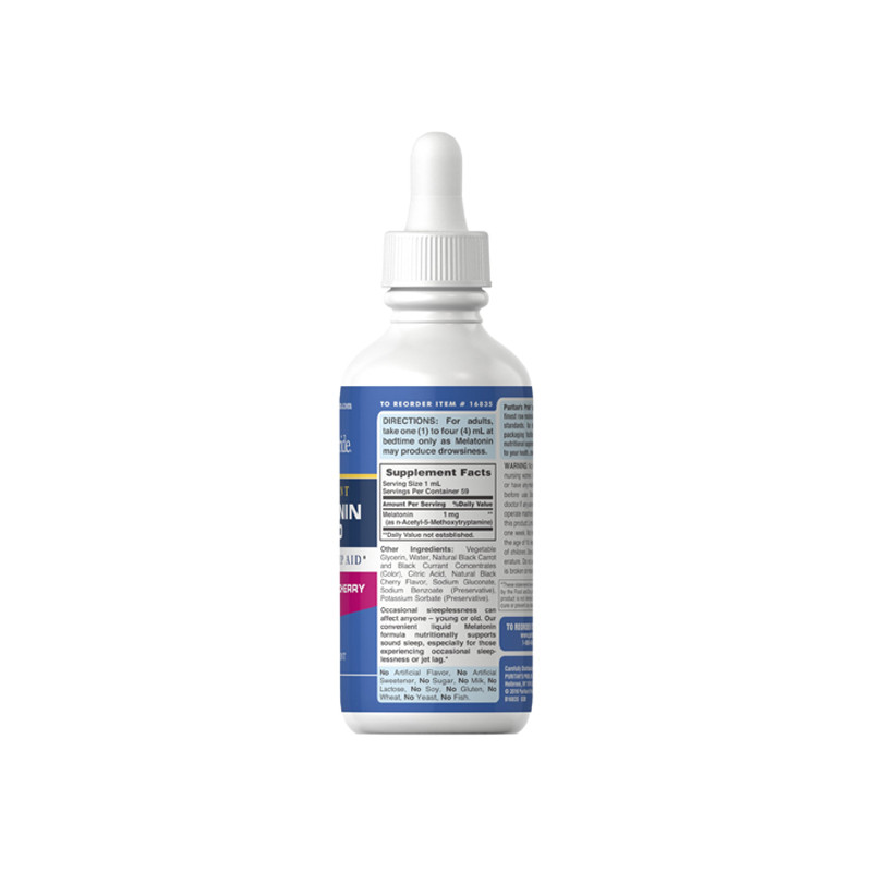Sublingual Melatonin Natural Black Cherry Flavor 1 мг від американського концерну Puritan's Pride – це рідкий мелатонін у високій концентрації – Мелатонін 1 мг чистої речовини на 1 мл рідини.