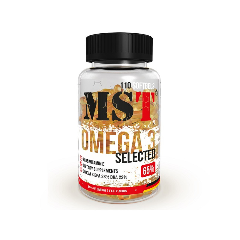 Omega 3 Selected від німецького виробника MST – чистий натуральний риб'ячий жир, посилений вітаміном Е. Відмінність цього продукту від аналогічних полягає у високій концентрації Омега 3 – вона становить 65%. Завдяки цьому ви легко покриваєте добовий дефіцит поліненасичених жирних кислот за допомогою лише однієї капсули.