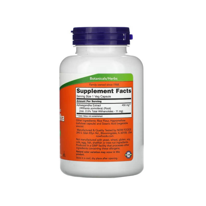 Біоактивна добавка Ashwagandha 450 від популярного американського бренду Now Foods – натуральний сертифікований продукт, основною речовиною, що діє, у складі якого є екстракт коренів ашваганди.