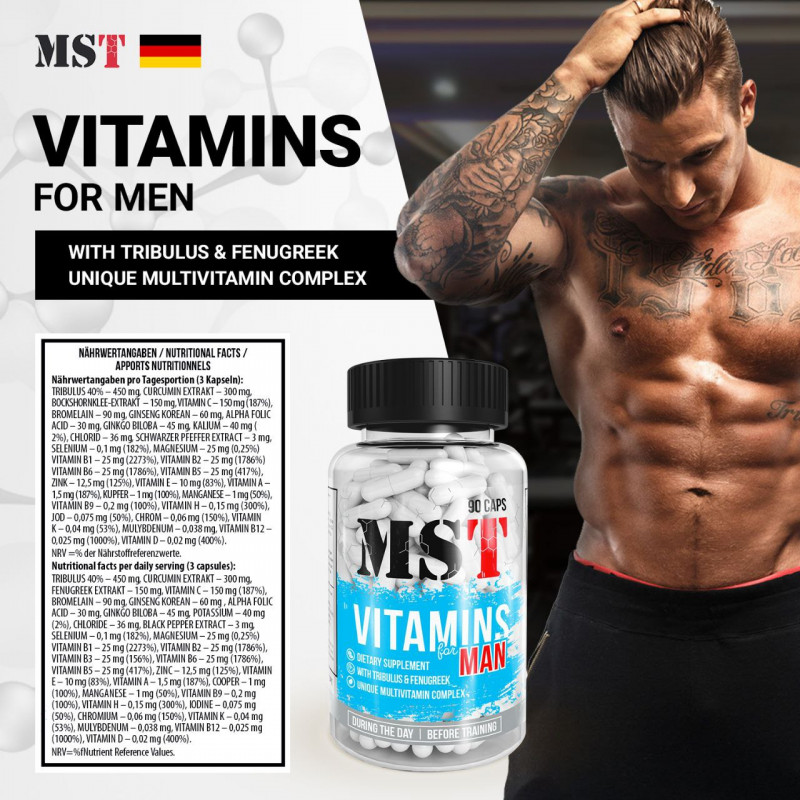 Vitamins for Men від виробника з Німеччини MST – унікальний оздоровчий комплекс для чоловіків, до складу якого входить 30 активних інгредієнтів природного походження – вітаміни та мінерали, альфа-ліпоєва кислота та рослинні екстракти.