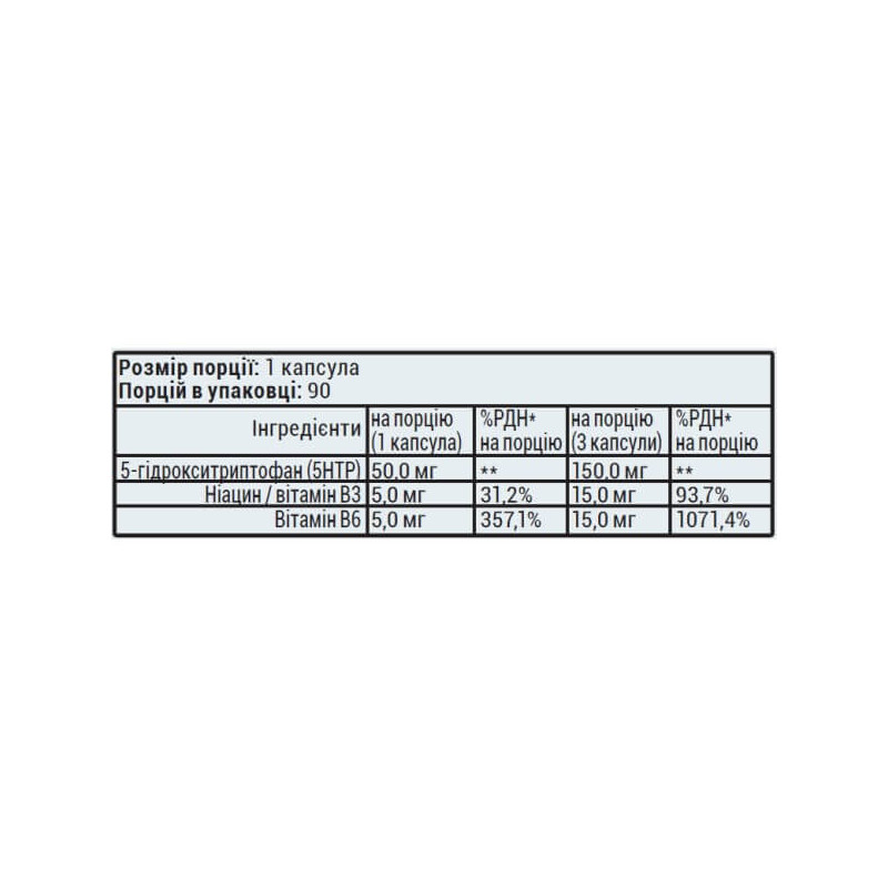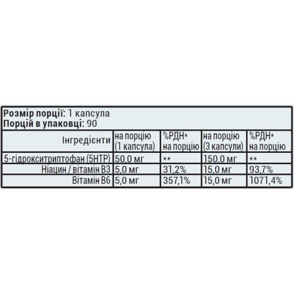 У добовій дозі цієї дієтичної добавки міститься добова норма 5-НТР, необхідна дорослій людині. Для більш відчутного ефекту основний компонент продукту доповнений та посилений вітамінами В3 та В6.