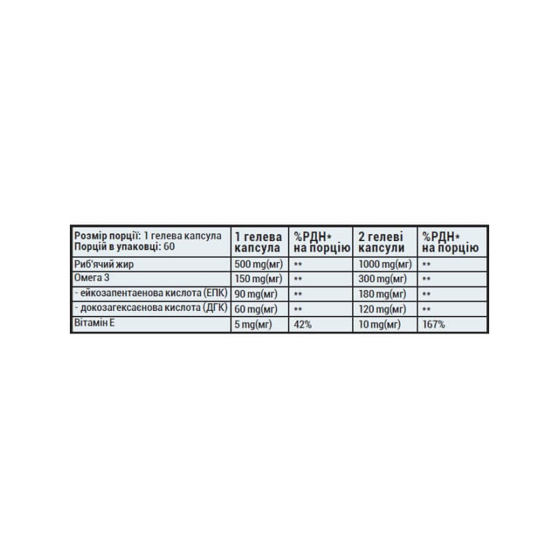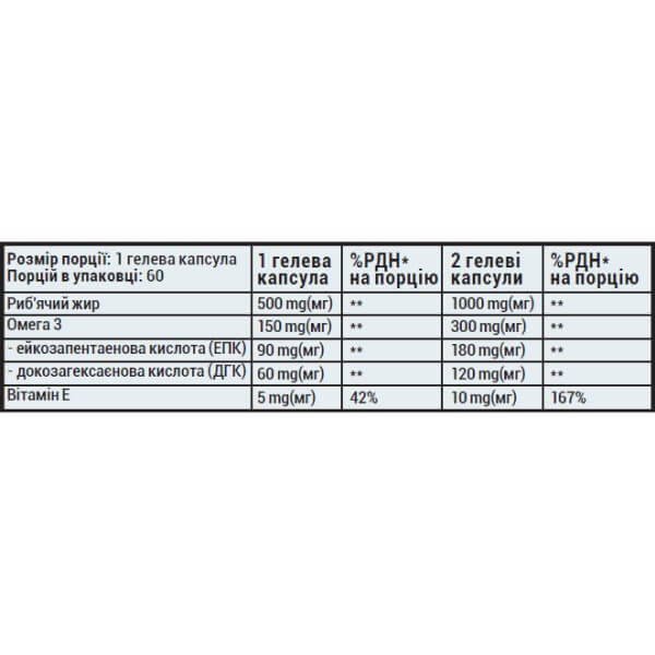 У добовій дозі Omega 3 Mini Gels рlus Vit E від Sporter з 2 софтгель-капсул міститься:
