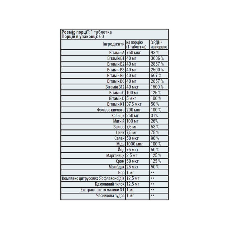 · по 1 мг екстракту листя малини та часникової пудри.