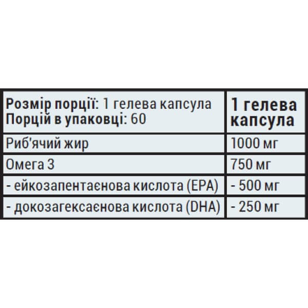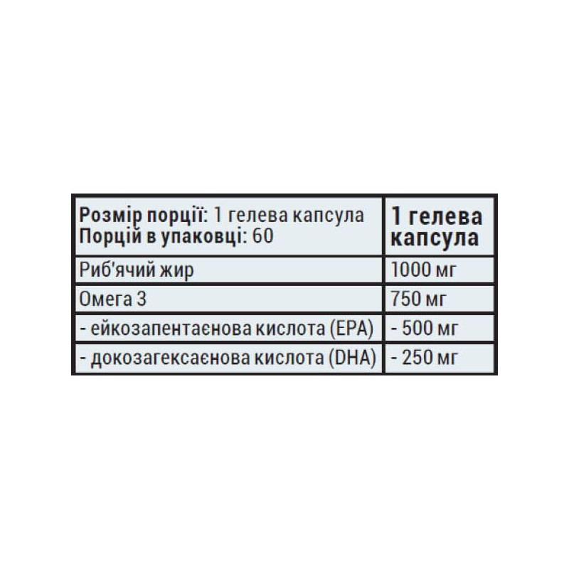 Ось склад Omega 3 Sporter з 500 EPA та 250 DHA на кожну капсулу: