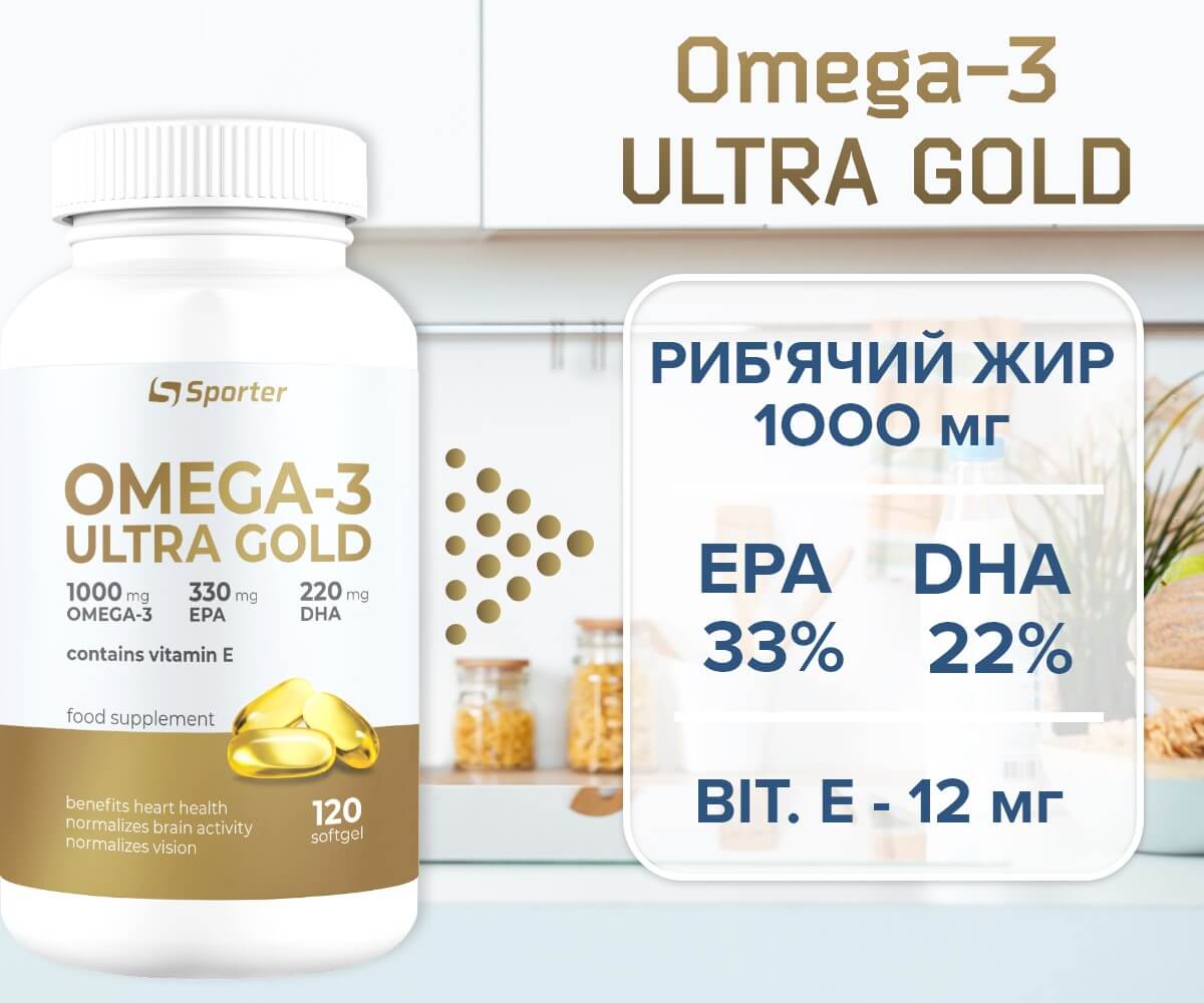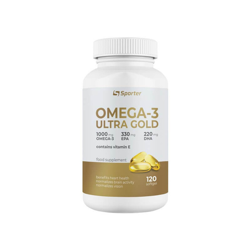 Omega-3 Ultra Gold – потужне джерело Омега3 від виробника Sporter, стовідсотково натуральний продукт, виготовлений із чистої сировини – філе риби жирних сортів, виловленої у холодних північних морях. Саме така сировина дозволяє отримувати риб'ячий жир з максимально високим вмістом EPA та DHA. Додаткову користь від застосування цієї біодобавки забезпечує вітамін Е.