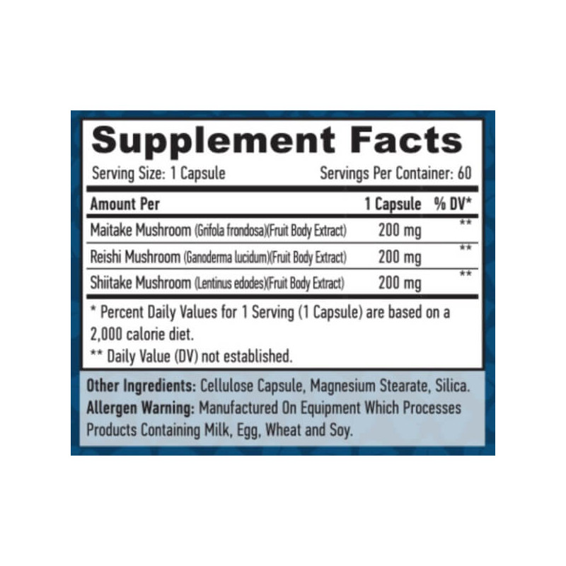 Triple Mushroom Complex від популярного американського бренду Haya Labs є унікальним натуральним комплексом з трьох видів грибів, що мають потужний позитивний вплив на організм. Ці гриби – шиїтаке, майтаку та рейші. У них міститься перелік вітамінів, мінералів, полісахаридів, амінокислот та інших важливих для здоров'я нутрієнтів. При цьому калорійність інгредієнтів, а отже, і найбіоактивнішої добавки є мінімальною.