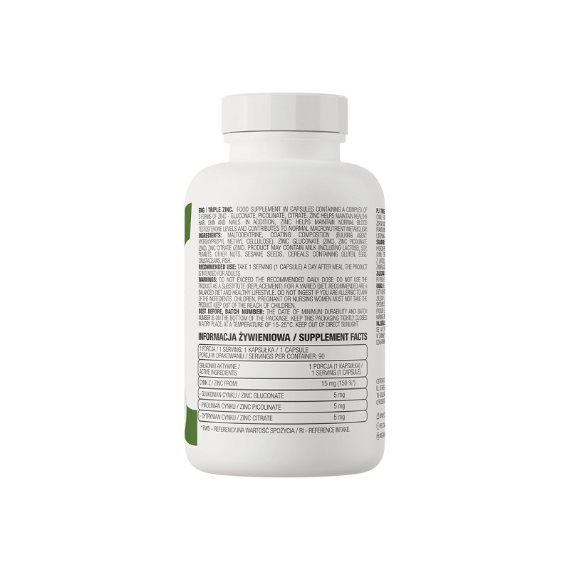 Triple Zinc від легендарного польського бренду OstroVit – комплексна збалансована біодобавка, що містить одразу три форми цинку – піколінат, глюконат та цитрат. Кожна їх має свої особливості з погляду засвоєння організмом, а синергії ці три форми приносять максимум можливої ​​користі.