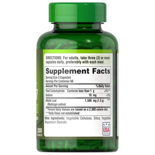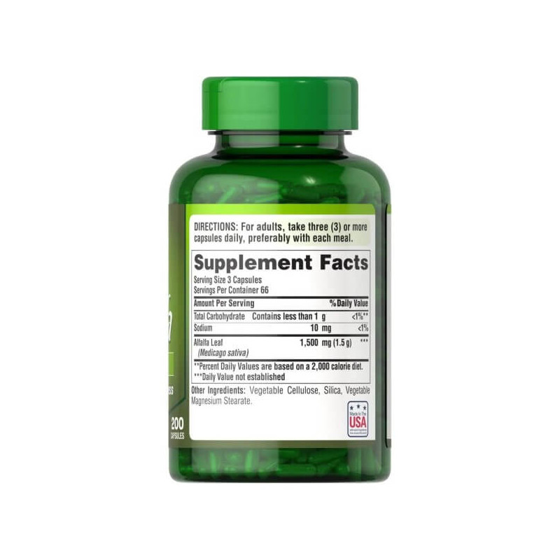 Alfalfa Naturally Sourced від провідного американського виробника біодобавок Puritan's Pride – високоочищений екстракт люцерни, отриманий із якісної сертифікованої природної сировини. Люцерна – трав'яниста рослина, до складу якої входить потужний комплекс корисних мікроелементів: кальцій, залізо, магній, фосфор, марганець, цинк, мідь та інші мінерали, вітаміни С, Е, К, D та групи В, хлорофіл, ензими, алкалоїди, естрогени , аспарагін, клітковина.