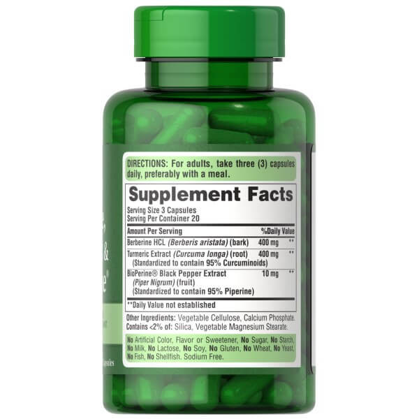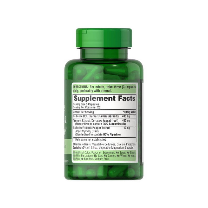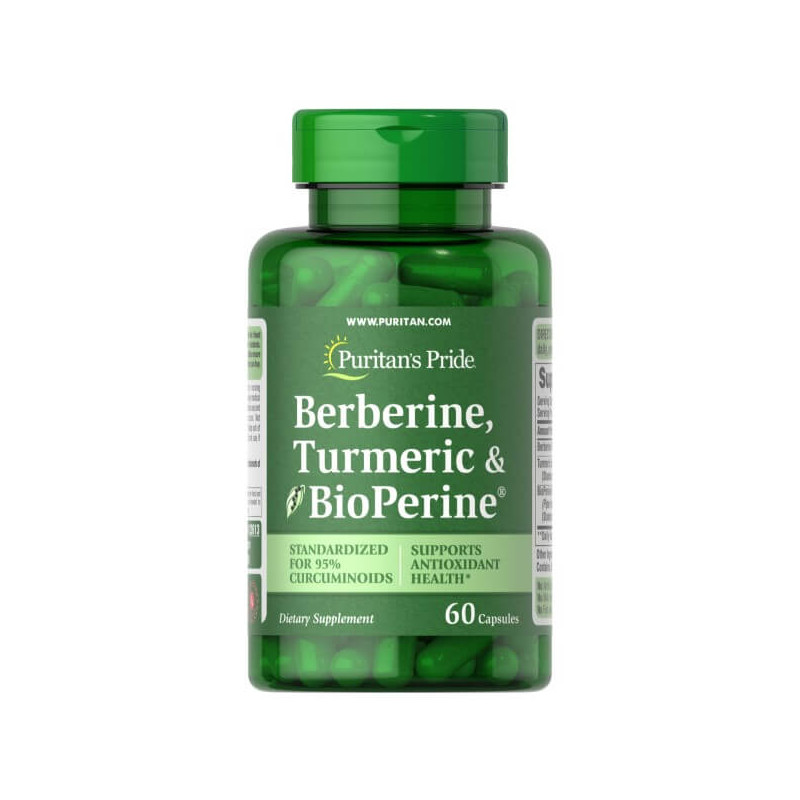 Berberine Turmeric & BioPerine Black Pepper від американського виробника Puritan's Pride – унікальна революційна формула із потужною комплексною дією. Збалансований мікс берберину, алкалоїду, що міститься в рослинах роду барбарисових, куркуми та чорного перцю позитивно впливає на органи та тканини, демонструючи підтримуючий та антиоксидантний ефект.
