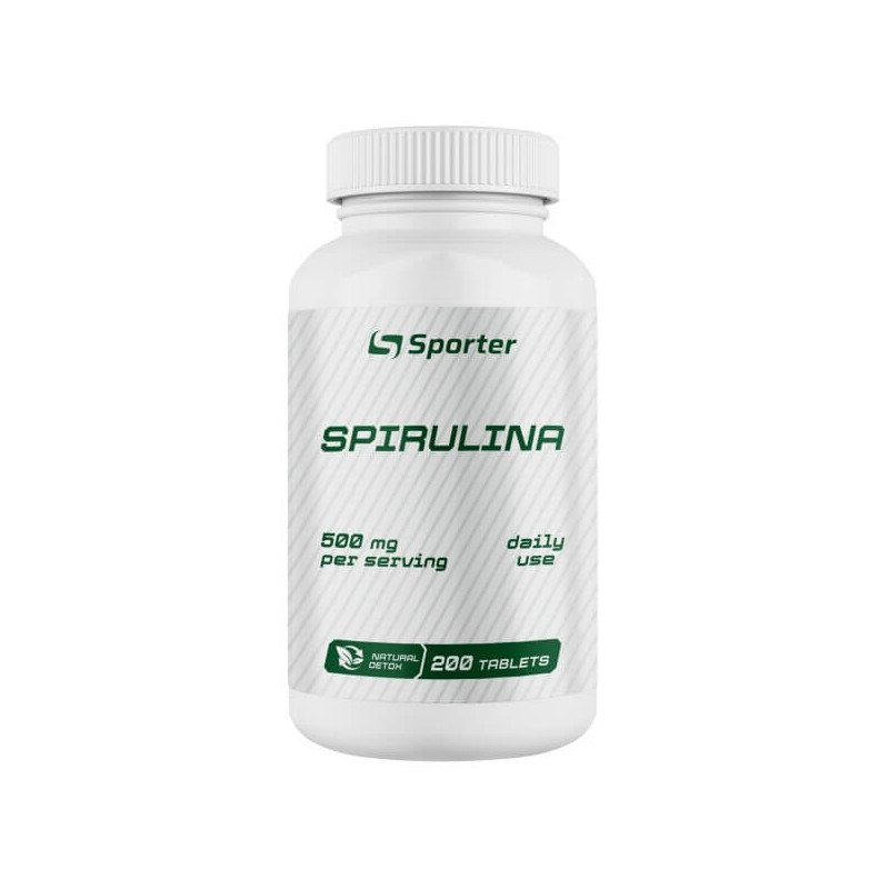 Spirulina – натуральна біодобавка від українського бренду Sporter, синьо-зелена мікроводорість спіруліна, вирощена та зібрана в екологічно благонадійних місцях та оброблена для найкращої засвоюваності. У цьому суперфуді міститься велика кількість ціанобактерій, а також 18 важливих амінокислот, антиоксиданти (хлорофіл, ГЛК, бета-каротин), вітаміни, мінерали, харчові волокна. Такий склад забезпечує комплексний позитивний вплив спіруліни на організм. А таблетована форма продукту гарантує комфортний прийом.