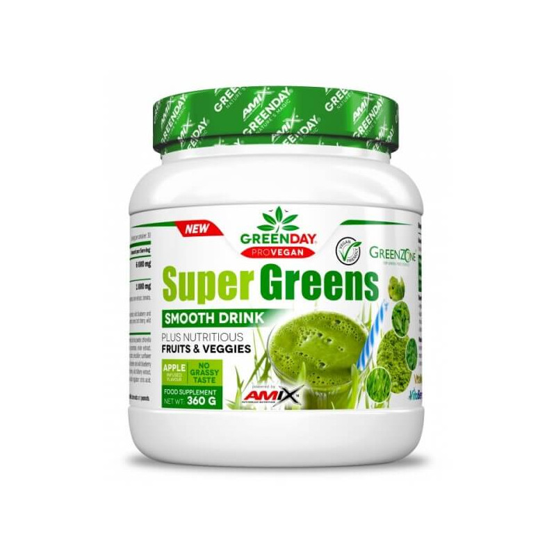 Greenday Super Greens Smooth Drink – натуральна харчова добавка від британського бренду Amix із стовідсотково рослинним складом. До нього входять рослинні феноли, екстракти та порошкові форми овочів, ягід, паростків, зелені, водоростей та інших рослинних культур. Вони ідеально збалансовані між собою у вигляді унікальних матриць Greens Complex (зелень), VitaVeggie (овочі) та VitaBerry (ягоди).