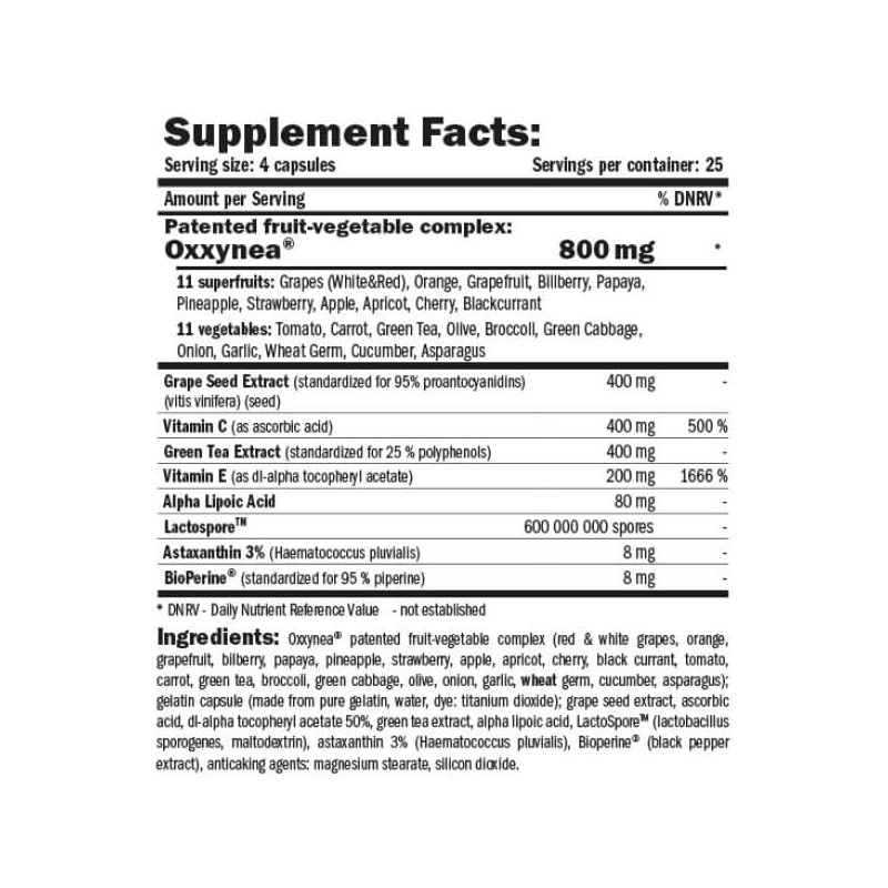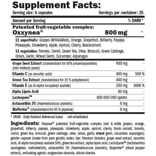 · 800 мг запатентованого міксу Oxxynea з 11 овочів та 11 фруктів (томат, морква, часник, цибуля, аспарагус, броколі, виноград, апельсин, грейпфрут, ананас, полуниця, папайя, інші);