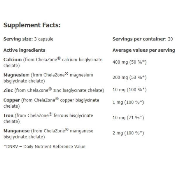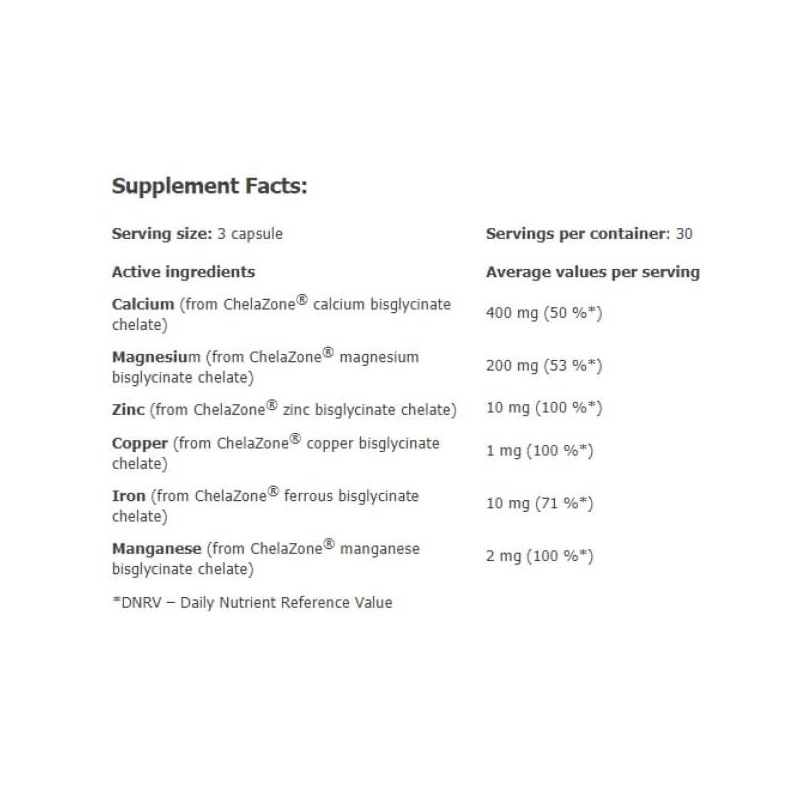 У порції Multichel Complete 6 Bisglycinate Chelate від Amix з 3 капсул міститься:
