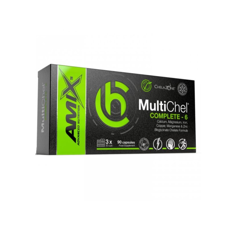 Multichel Complete 6 Bisglycinate Chelate від бренду спортивного харчування з Великобританії Amix – мінеральний мультикомплекс, усі шість складових якого представлені в адаптованій, максимально біодоступній формі хелату бісгліцинату. Завдяки цьому продукт відмінно засвоюється, демонструючи позитивний ефект без побічних реакцій. А за комфортний та безпечний прийом відповідає оптимізована форма капсул.