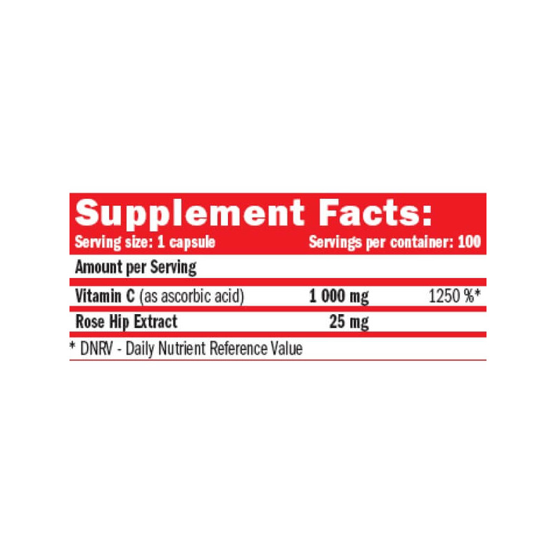 До складу кожної капсули дієтичної добавки C-Vitamin + Rose Hips від Amix входить: