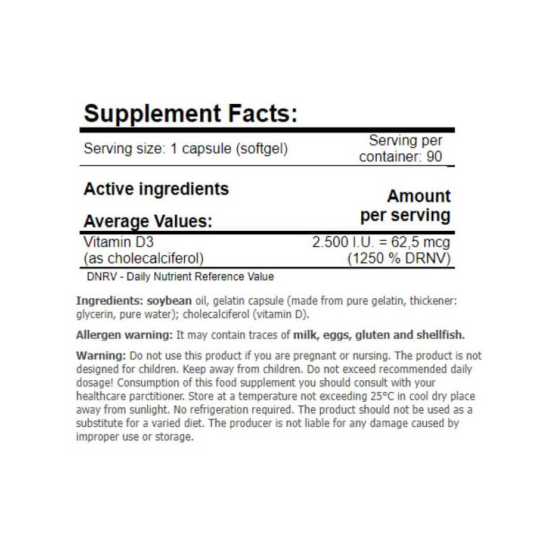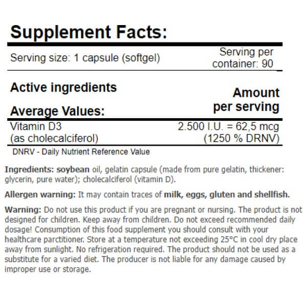 Біоактивна добавка представлена у комфортній для вживання капсульній формі. У кожній капсулі міститься 2500 МО чистого нутрієнта. Таке дозування дозволяє швидко ліквідувати невеликий чи середній дефіцит вітаміну Д3 в організмі дорослої людини.