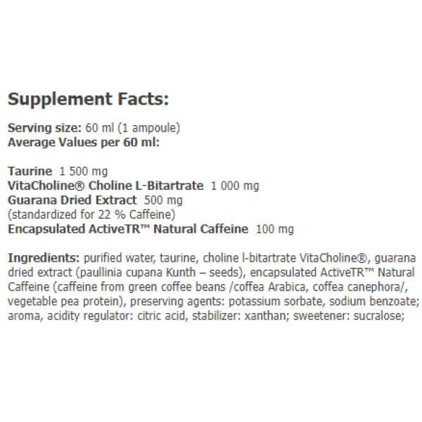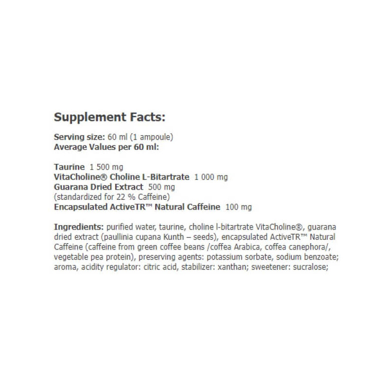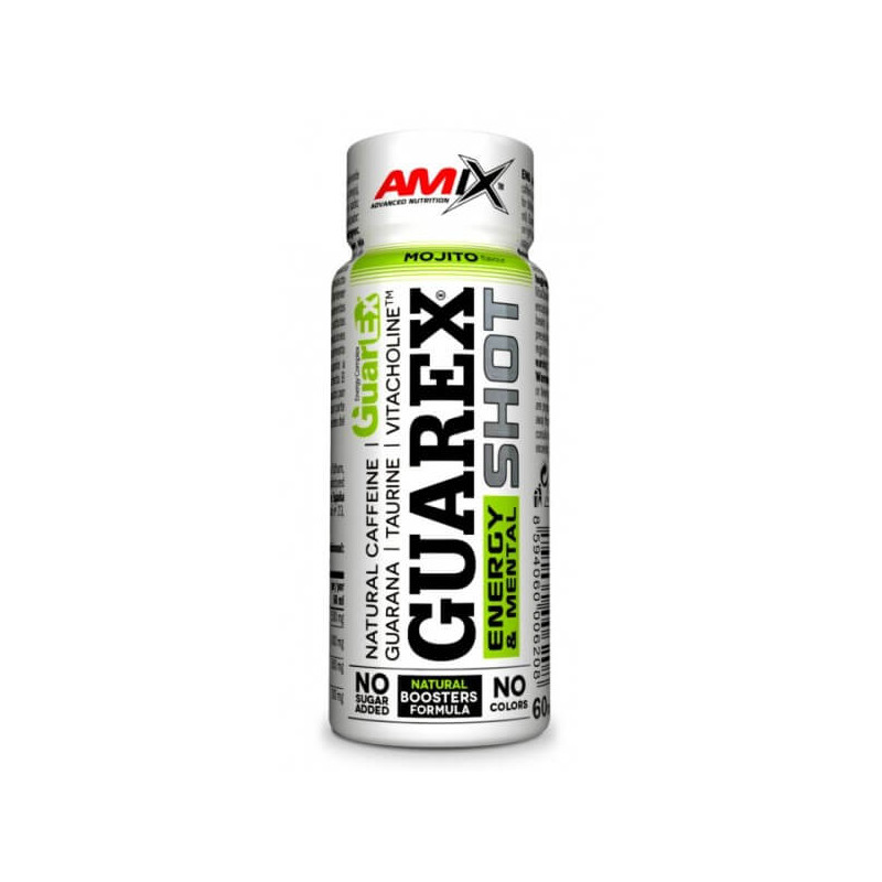 Guarex Energy & Mental Shot від провідного європейського виробника Amix – рідка біодобавка-енергетик, що є збалансованою комбінацією холіну у вигляді запатентованої матриці VitaCholine, таурину, екстракту гуарани та обробленого кофеїну у вигляді унікальної формули ActiveTR. Вона містить у собі кофеїн, отриманий із зерен арабіки та робусти, а також гороховий протеїн. Технологія мікроінкапсуляції дозволяє позбутися характерної гіркоти натуральної кави та забезпечує поступове вивільнення та рівномірне засвоєння кофеїну.