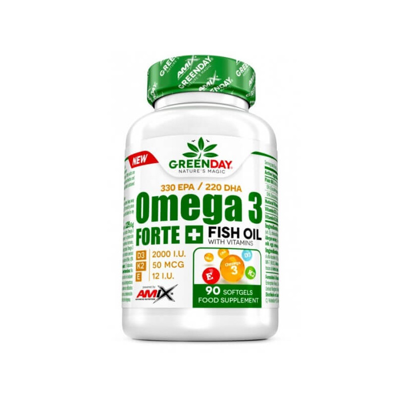Omega3 Forte + від популярного англійського бренду Amix – біоактивна добавка із колекції Greenday, натуральний збалансований продукт, до складу якого входить високоякісний жир риби екологічно чистих північних морів з високим вмістом ненасичених жирних кислот Омега3. Основний інгредієнт доповнений вітамінами, що посилюють позитивний вплив на організм цієї біодобавки.