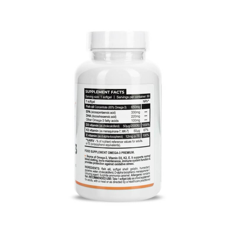 Omega-3 Premium від провідного виробника з Угорщини Progress Nutrition – збалансована органічна біоактивна добавка, до складу якої входить високоочищений жир, отриманий з риби, що мешкає у північних морях, а також вітаміни D3, К2 та Є. Якісна сировина преміум-класу, оптимальна концентрація нутрієнтів та чудова засвоюваність роблять цей продукт максимально ефективним. А продумана форма – невеликі софтгель-капсули з м'якою оболонкою – гарантує комфортний та безпечний прийом.