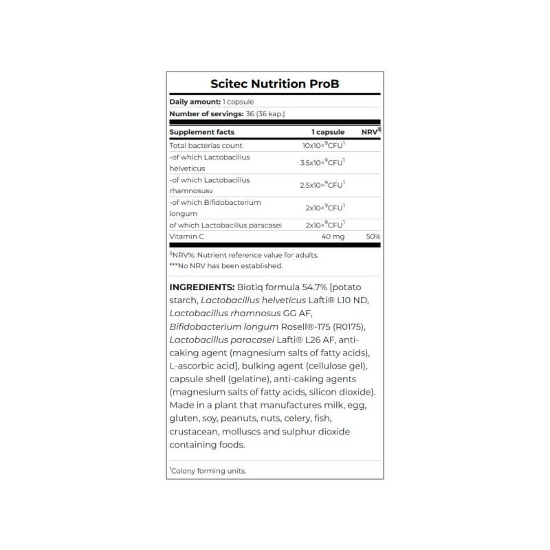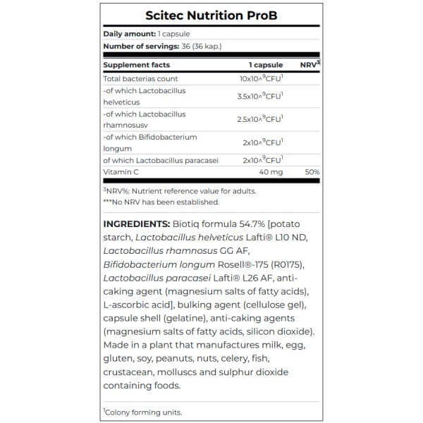 ProB від популярного виробника спортивного харчування Scitec Nutrition – натуральна біодобавка пробіотичного спектра дії. До її складу входять чотири штами живих бактерій, що становлять основу кишкової мікрофлори здорової людини, а також вітамін С в оптимальному дозуванні.
