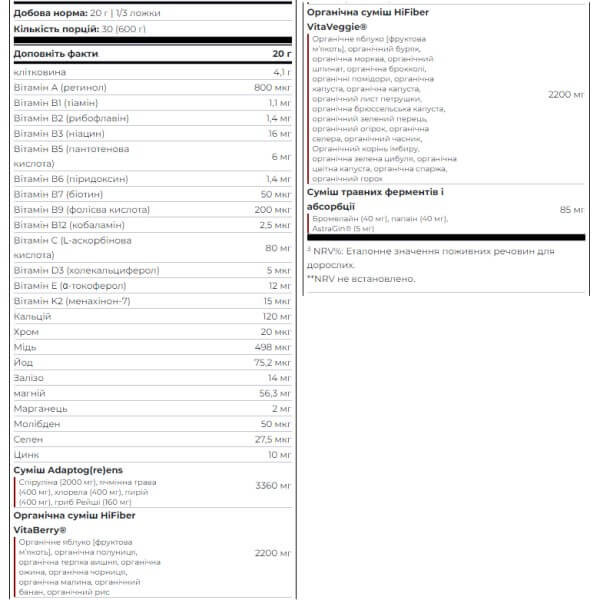 Vita GreenS & Fruits від відомого бренду Scitec Nutrition – мультикомпонентна органічна біодобавка, що допомагає отримувати необхідні організму нутрієнти навіть за обмеженого або незбалансованого харчування. До її складу входять вітаміни, мінерали, зелень, овочі, фрукти, трави, злаки, водорості, гриби та харчові ферменти. Ви можете вживати будь-які продукти та страви без побоювання нашкодити організму, якщо у вашому арсеналі здоров'я буде присутній комплекс Vita GreenS & Fruits у швидкорозчинному порошку з приємним натуральним смаком.