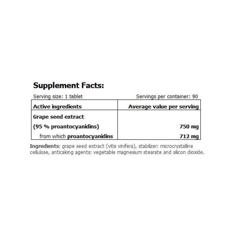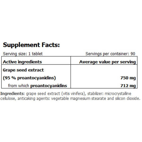· 750 мг екстракту виноградних кісточок, у тому числі, 712 мг проантоціанідинів;