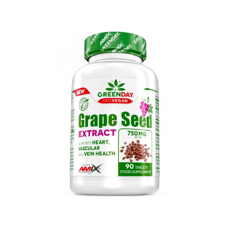 Grape Seed Extract - біоактивна добавка від британського виробника Amix, який створив популярну колекцію рослинних продуктів Greenday Provegan. Вона є невеликими таблетками, зручними і безпечними у вживанні. Активною речовиною у складі цього продукту є екстракт виноградних кісточок з високим вмістом поліфенолів, а саме проантоціанідинів, а також флавоноїдів.
