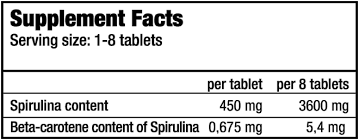 Склад біодобавки (в 1 таблетці): 450 мг спіруліни, 0,675 мг бета-каротину.