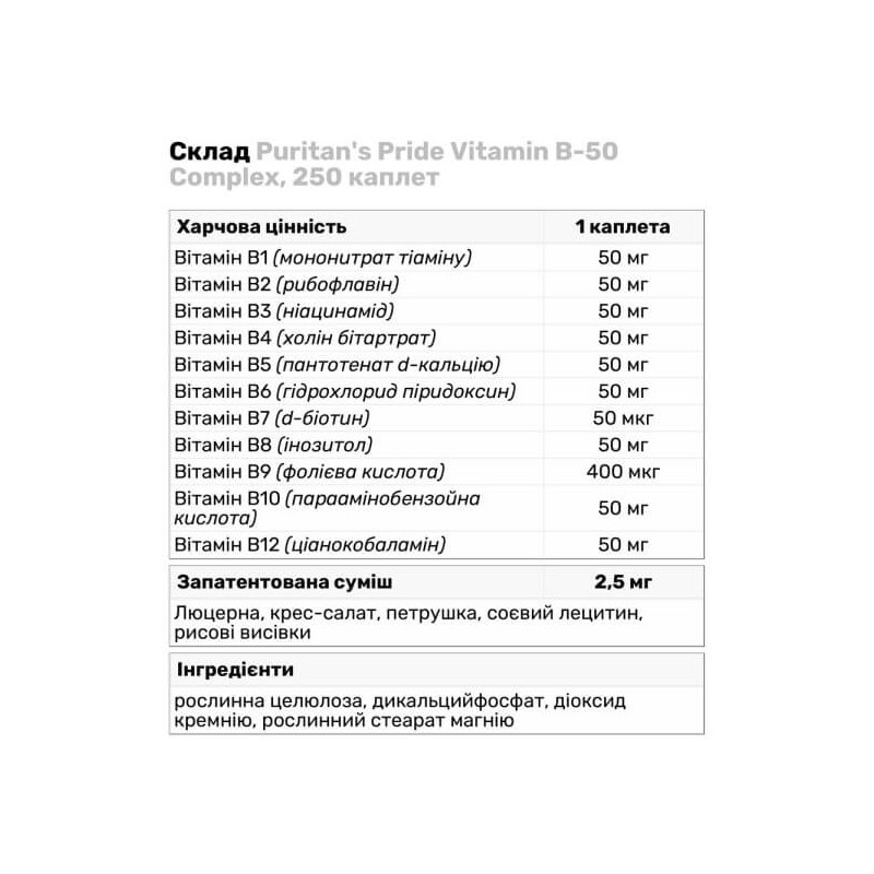 Vitamin B-50 Complex від американського виробника Puritan's Pride – унікальна харчова добавка, в яку включені найбільш значущі для життєдіяльності організму вітаміни групи В.