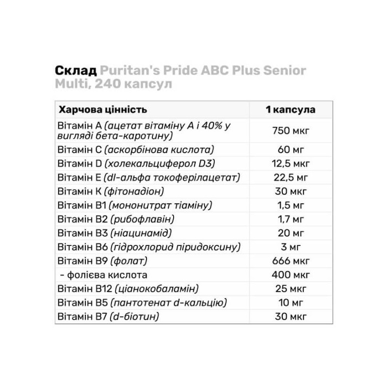 ABC Plus Senior Multivitamin Multi-Mineral Formula від американського бренду біодобавок Puritan's Pride – це ретельно продуманий та ідеально збалансований вітамінно-мінеральний комплекс для людей похилого віку.