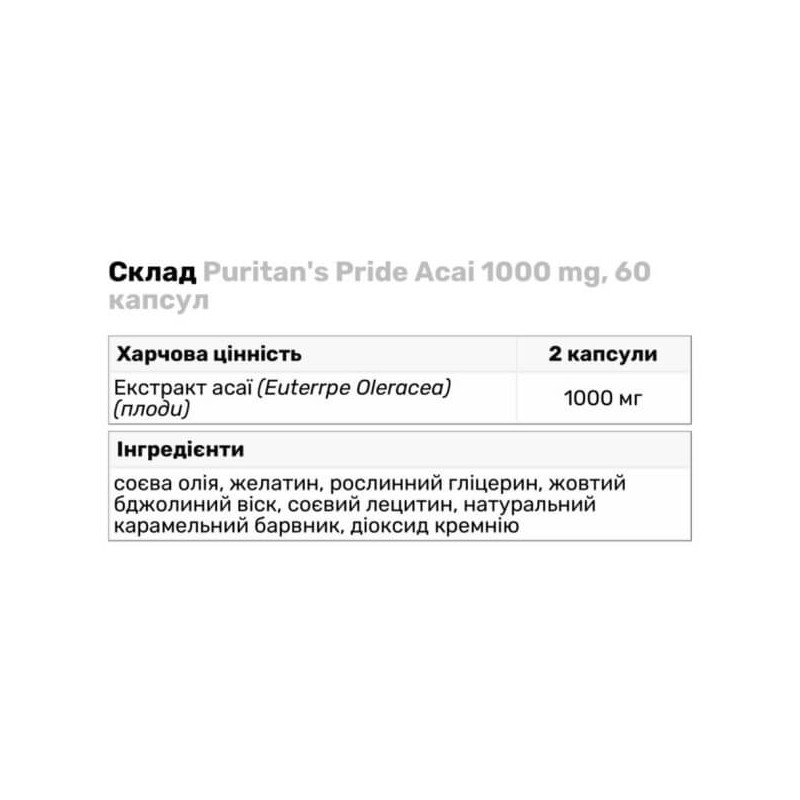 У порції дієтичної добавки Acai від Puritan's Pride із двох гелевих капсул міститься: