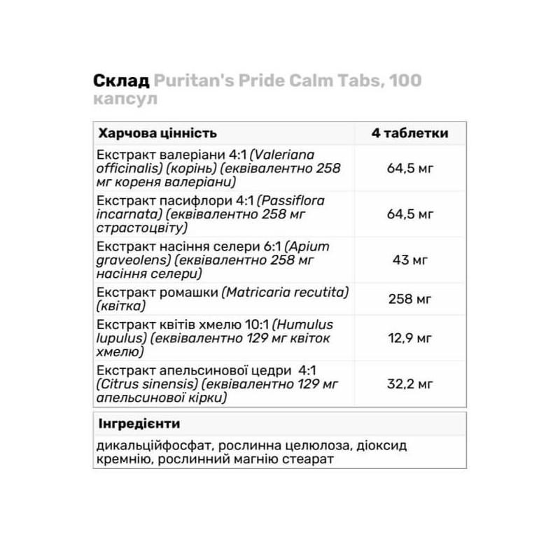 У порції біодобавки Calm Tabs від Puritan's Pride з 4 таблеток міститься: