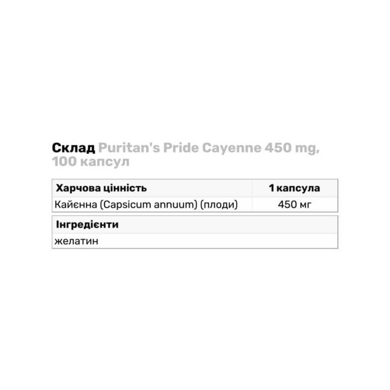 Cayenne від відомого американського бренду спортивного харчування Puritan's Pride – рослинна біодобавка, активною діючою речовиною у складі якої є гострий кайєнський перець у подрібненій порошковій формі, поміщений у невеликі желатинові капсули.