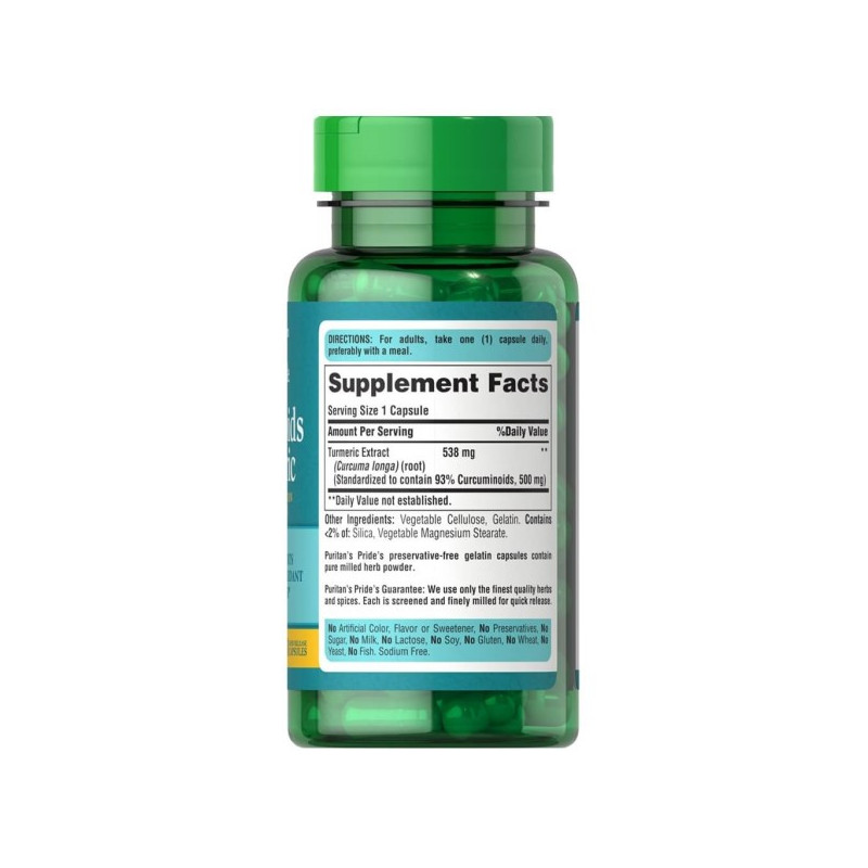 Curcuminoids from Turmeric від відомого американського бренду Puritan's Pride – біоактивна добавка на основі кореня куркуми. У складі цієї частини рослини міститься велика кількість куркуміноїдів – потужних натуральних антиоксидантів, а також ефірні олії, вітаміни групи В, С, Н, РР та значний комплекс мінералів.