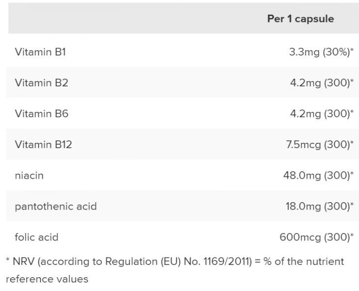 Тіамін (B1) необхідний для нормального функціонування нервової системи і обміну вуглеводів. Рибофлавін (B2) бере участь у процесах утворення енергії з їжі і підтримує здоров'я шкіри. Ніацин (B3) сприяє нормальній роботі травної системи і бере участь в регуляції рівня холестерину в крові. Пантотенова кислота (B5) підтримує синтез гормонів і обмін жирів. Піридоксин (B6) відіграє важливу роль в обміні амінокислот і нормалізації нервової активності. Біотин (B7) бере участь в синтезі жирних кислот і підтримує здоров'я волосся і нігтів. Фолієва кислота (B9) важлива для клітинного ділення і синтезу ДНК. Кобаламін (B12) підтримує здоров'я нервової системи і бере участь в утворенні червоних кров'яних клітин.