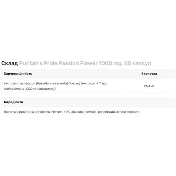 Passion Flower від популярного американського бренду Puritan's Pride – біодобавка, активною основою якої є екстракт пасифлори.