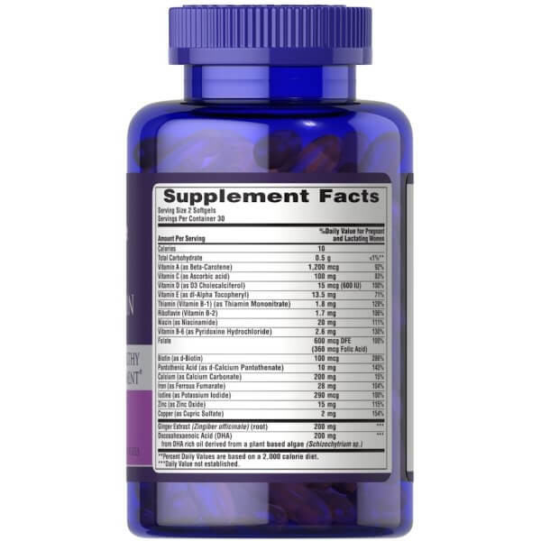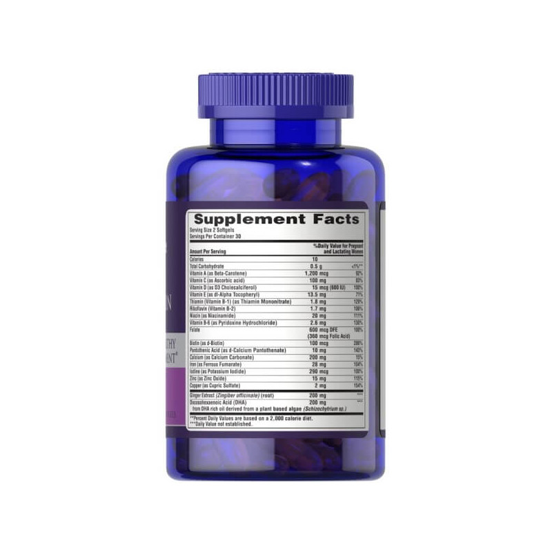 Prenatal Multivitamin with DHA – мультивітамінний комплекс для вагітних жінок від американського виробника Puritan's Pride, посилений мінералами, поліненасиченою жирною кислотою класу Омега 3, а саме докозагексаєновою (ДГК), та екстрактом імбиру.