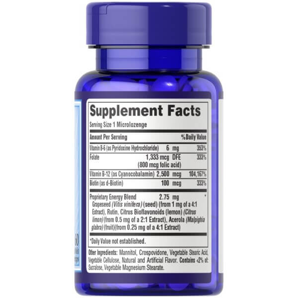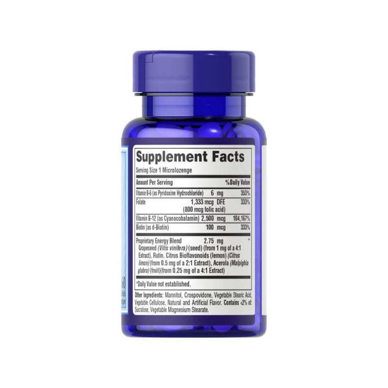 Sublingual Vitamin B-12 з Folic Acid, Vitamin B-6 та Biotin від відомого виробника із США Puritan's Pride – ідеально збалансований комплекс вітамінів групи В, посилений рослинними екстрактами у вигляді унікальної авторської суміші. У виробництві даної біодобавки використовується лише натуральна чиста сировина бездоганної якості. Тому її прийом не супроводжується негативними реакціями з боку організму.