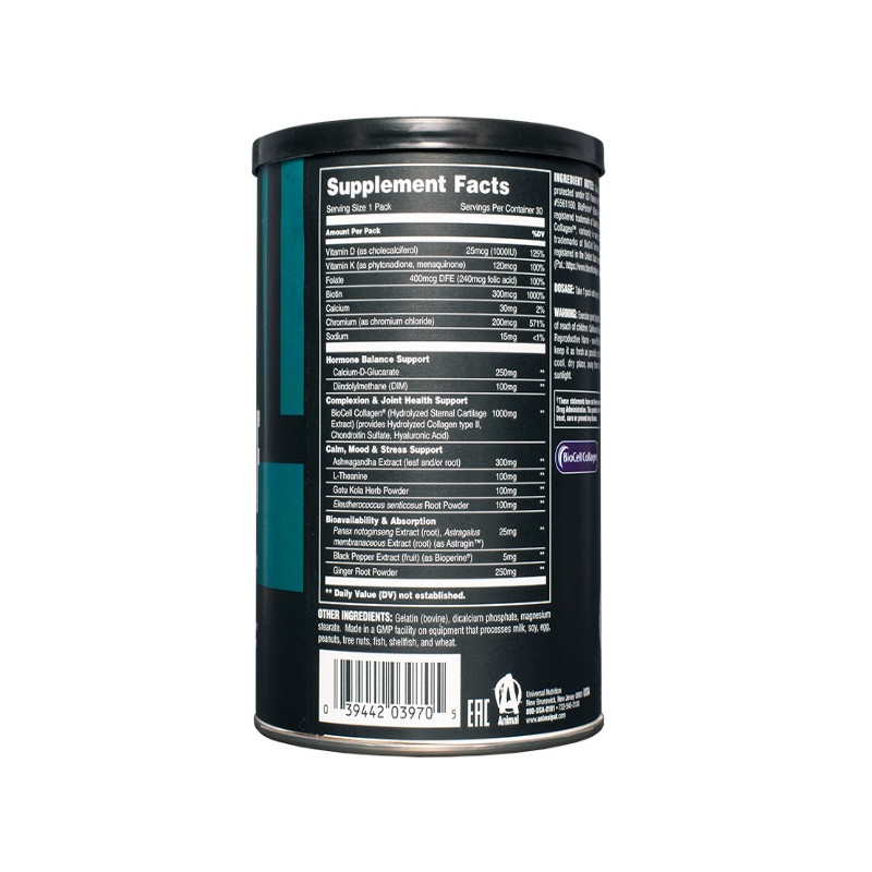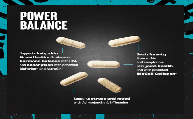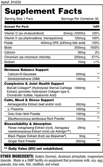 Вітамін D, вітамін K, фолат, біотин, кальцій, хром, натрій, какліум-D-глюкарат, дііндолілметан (DIM), колаген, екстракт ашвагандхи, L-теанін, порошок трави готу кола, порошок кореня елеутерококу сентікозуса, екстракт панаксу нотоінсенга, екстракт астрагалу перетинчастого, екстракт чорного перцю, порошок кореня імбиру.