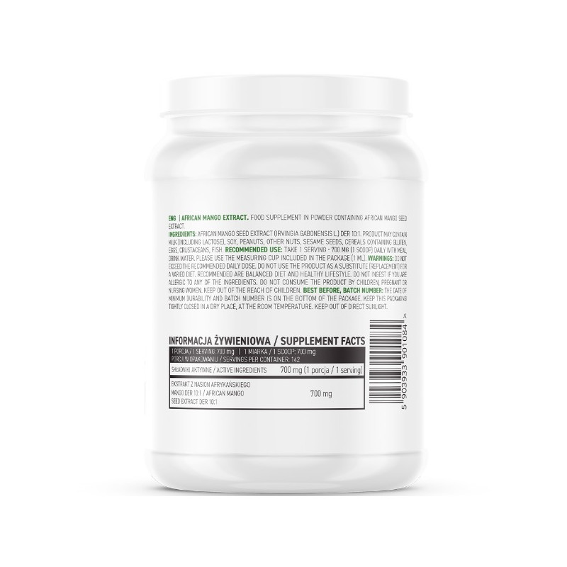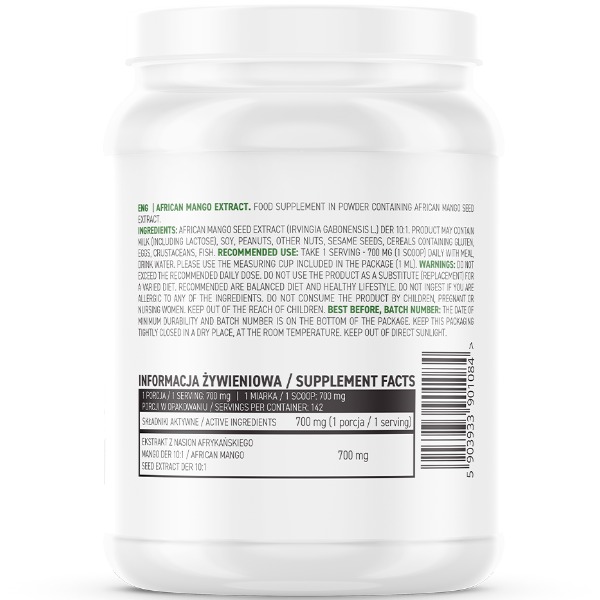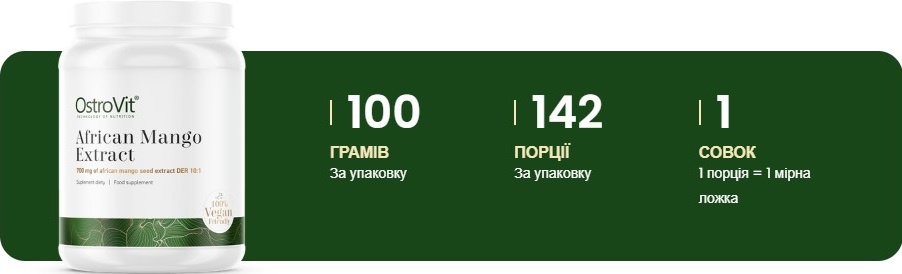 2. Підтримка обміну речовин та контроль ваги: Африканське манго відоме своєю здатністю допомагати контролювати вагу шляхом поліпшення обміну речовин та зменшення апетиту. OstroVit African Mango Extract може бути корисним доповненням до здорового способу життя та дієти.