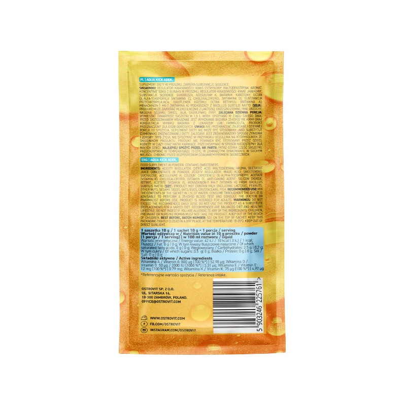 Енергетична Підтримка: Aqua Kick ADEK OstroVit додає енергії та жвавості вашому дню завдяки комплексу вітамінів та інгредієнтів, які підтримують правильне функціонування енергетичних систем організму.