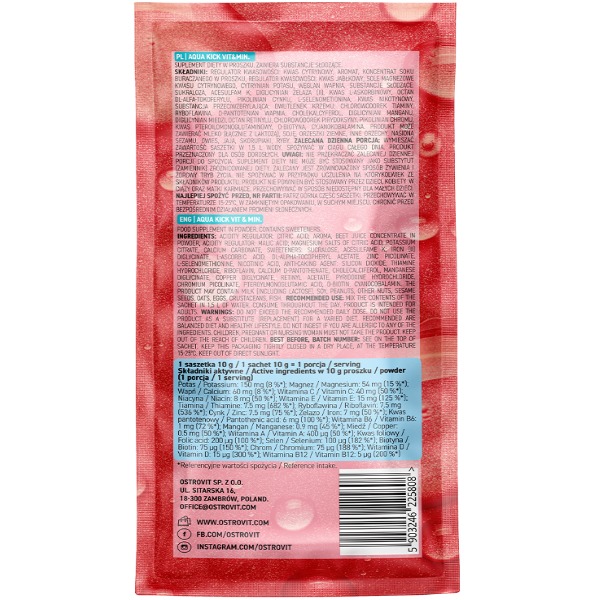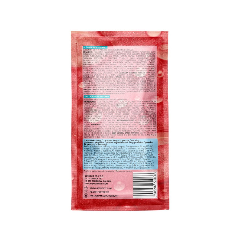 Однією з ключових особливостей продукту є його форма - порошок, який легко розчиняється у воді. Це робить Aqua Kick VIT&MIN зручним у використанні, дозволяючи легко приготувати напій з вітамінами та мінералами в будь-який зручний час. У складі продукту можна знайти широкий спектр вітамінів, таких як A, C, D, E, а також ряд важливих мінералів, включаючи кальцій, магній, цинк та багато інших.