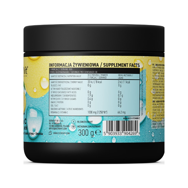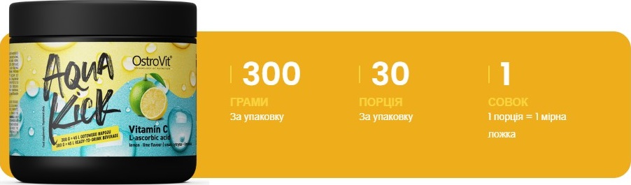 OstroVit Aqua Kick Vitamin C-це продукт, спеціально створений для забезпечення організму вітаміном C, який відомий своїми сильними антиоксидантними властивостями та важливою роллю у підтримці імунітету та загального здоров'я. В даному описі ми детально розглянемо склад, корисні властивості та способи використання Aqua Kick Vitamin C, надаючи повноцінне уявлення про його переваги та вплив на організм.