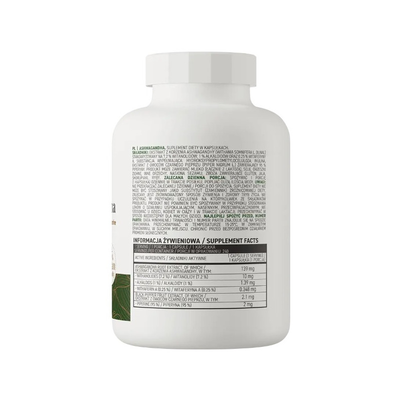 Інгредієнти: Екстракт кореня ашваганди (Withania somnifera L. Dunal), стандартизований по 7,2% вітанолідів, 1% алкалоїдів, 0,25% вітаферину А, наповнювач: гідроксипропілметилцелюлоза; інулін, екстракт плодів чорного перцю (Piper nigrum L.), що містить 95% піперину.