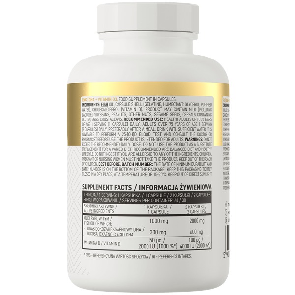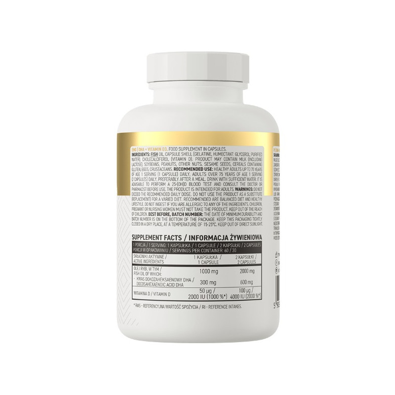 DHA + Vitamin D3 OstroVit - це продукт, призначений для підтримки здоров'я організму та його нормального функціонування. Він містить два ключові компоненти: рибий жир, який багатий на докозагексаєнову кислоту (DHA), та вітамін D3. Розглянемо їх ролі та переваги детальніше.