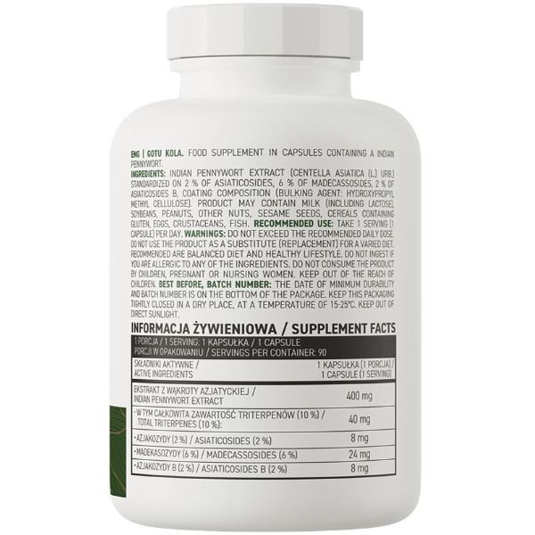 Gotu Kola, або центелла азійська, є рослинним екстрактом, який вже багато століть використовується в традиційній медицині різних культур за свої благотворні властивості. У складі Gotu Kola VEGE OstroVit ви знайдете високоякісний екстракт цієї рослини, який містить загальні тритерпени, такі як азіакозиди, мадекассосиди і азиатикозиди.