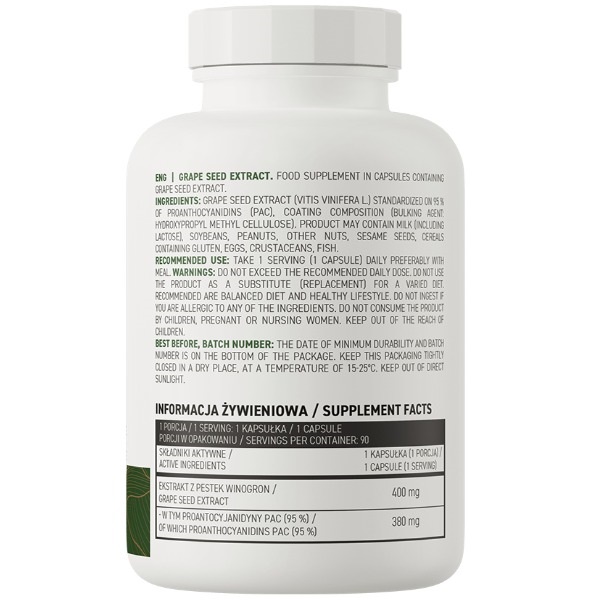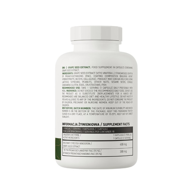 Екстракт виноградних кісточок (Vitis vinifera L.) стандартизований до 95% проантоціанідинів (PAC), оболонка капсули (наповнювач: гідроксипропілметилцелюлоза).