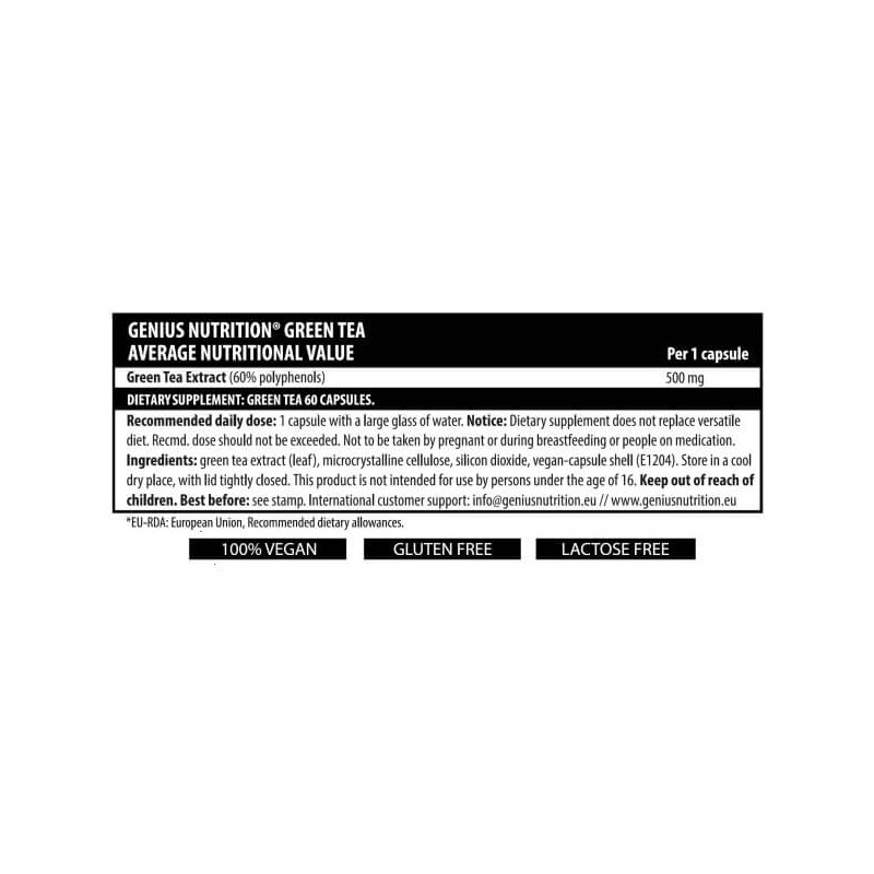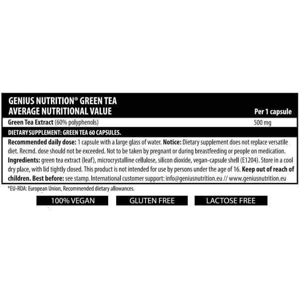 Green Tea від виробника зі Швеції Genius Nutrition - повністю натуральна біодобавка-жироспалювач, високоочищений стандартизований екстракт листя зеленого чаю. Ця рослина має унікальний склад – у ньому містяться вітаміни, мінерали, поліфеноли, кофеїн, токофероли, каротиноїди, дубильні та інші корисні речовини.