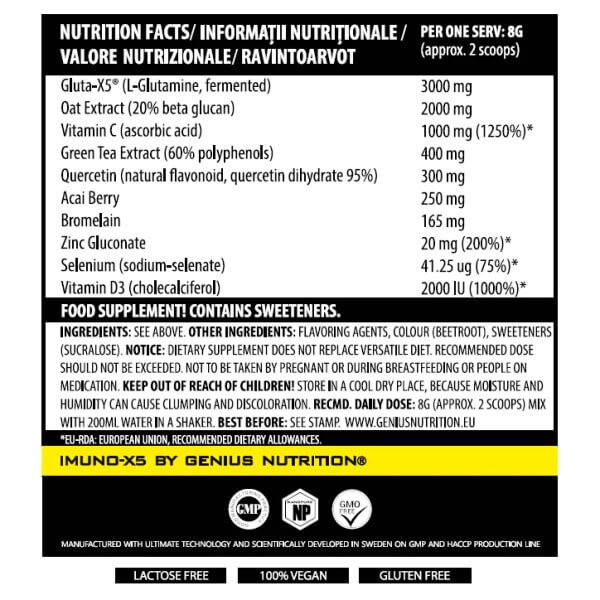 Imuno-X5 від компанії зі Швеції Genius Nutrition – унікальний біоактивний комплекс з імуномодулюючим, імуностимулюючим та антиоксидантним ефектом, виготовлений з натуральної сировини та представлений у вигляді порошку з яскравим та насиченим фруктово-ягідним смаком. До його складу входять природний ферментований глутамін, вітаміни, мінерали, рослинні порошки та екстракти.